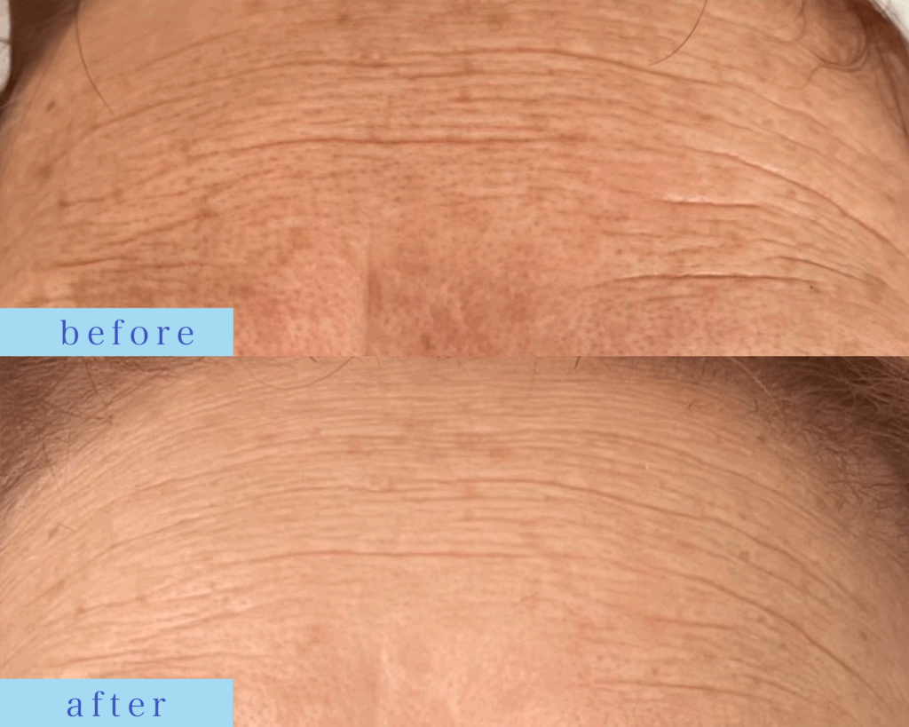 Beforeでは、額の横ジワが深く刻まれ、乾燥とハリ不足が見られました。